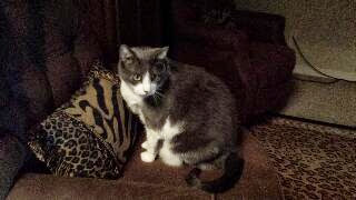 This evening I spotted Stuffy sitting on a chair in the office as I walked in. I went over to say hi to him for a minute. As I turned the corner to go to the kitchen, Oreo meowed at me. He did a big stretch, then came over and rubbed up against my leg. He was pretty much attached to me until I delivered his dinner! Stuffy had moved to the edge of the living room to wait for me. Both boys joined me at our spot today for some attention. They laid on either side of me and enjoyed plenty of chin scratches. After a little while, Oreo went to go eat some more. Stuffy remained and continued to get pet. Eventually, he got up and laid elsewhere. As I was leaving, I saw that Oreo had moved to the entryway to lounge on the rug. Silly boy.