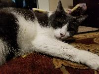 This morning Oreo was in his usual spot. I brought him his pill, since he was too comfy on his chair to get up. He ate that, then came to the kitchen for the rest. I called for Stuffy but he didn't come out this time. I went to find him and he was lounging in the closet today. I brought his food for him there and he ate, then wandered out to join Oreo by the fireplace. I was just thinking yesterday, I haven't seen Charlie in forever, but I know someone is at least coming to eat, because the bowl is always empty. This morning I flicked on the light and saw the white calico kitty eating! It of course got scared and ran away. It was good to see someone though. After that, I went to sit by the boys and give them some pamper time. This evening I came in and saw someone had come by. They left the boys each a tin of their special treats. Oreo was hanging out in the living room, so I brought him his pill and food there. I called for Stuffy again, but had to go find him. He was upstairs this time. He meowed from his spot near the railing in the hall as I walked by on the steps. I brought his food, but he wouldn't touch it. I wasn't sure when the treat person came by today, so I tried to bribe him with more treats, just so he'd eat a little something and I could give him his insulin. Unfortunately, he wasn't interested in that either, so we had to skip his shot tonight. Poor Oreo was just sitting and waiting so patient for me by the fireplace. Haha. I turned it on for him and he cozied up by me for his chin rubs. Stuffy came down later on for some brushes too. As I was leaving, Stuffy went and sat by the back door and seemed interested and was meowing. I flicked on the light again to see what was up. Well... I guess it was the "other" white "kitty" that has been eating all the food lately!! Haha. I shoo-ed him off the counter. The garbage cans don't seem to be doing the trick. He went up and over the counter and down off the chairs. So that was an eventful evening! Haha!